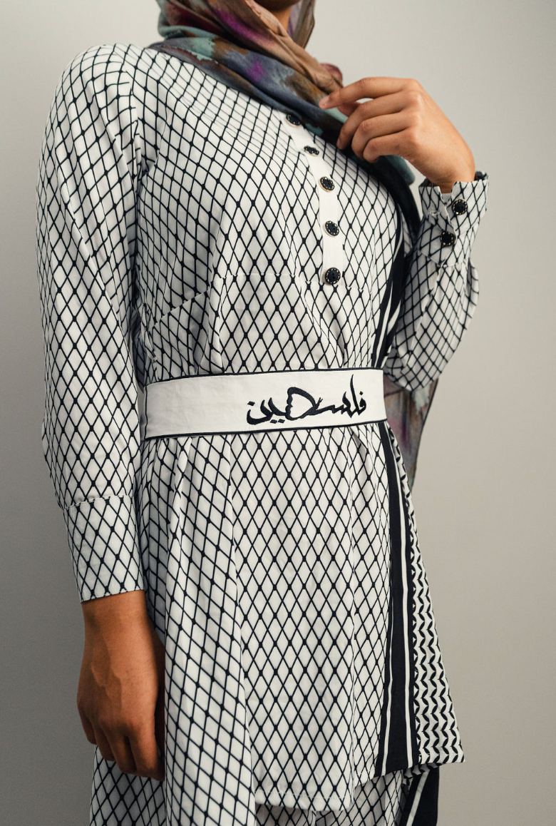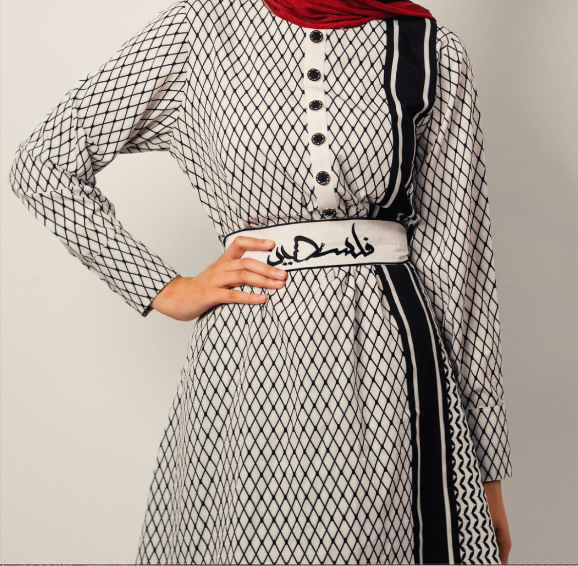 This item features embroidered designs. The word 'Palestine' (فلسطين) in Arabic, along with the butterfly, is embroidered.