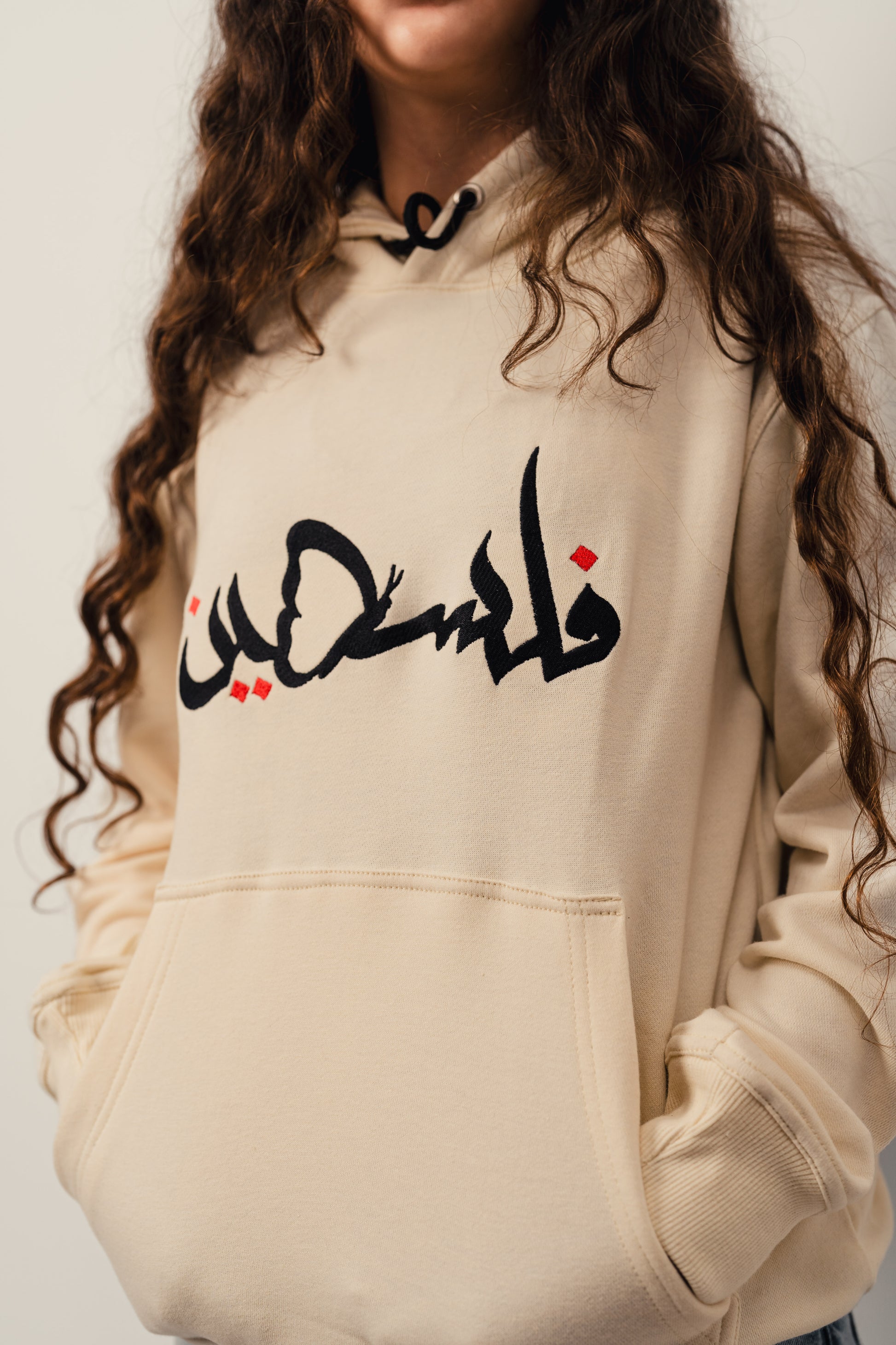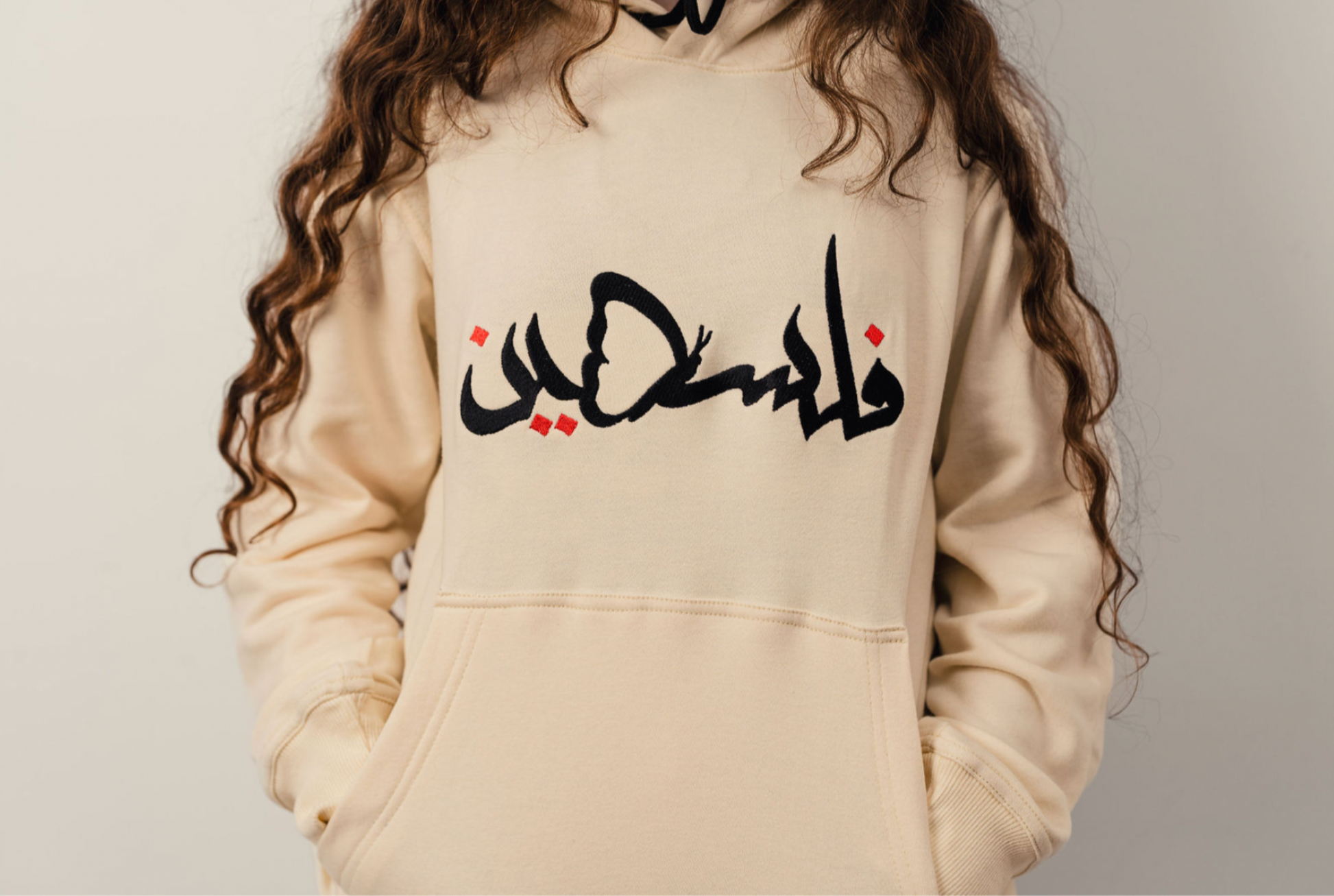 This item features embroidered designs. The word 'Palestine' (فلسطين) in Arabic, along with the butterfly, is embroidered.